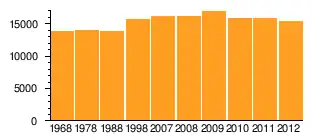 | Habitants[7] | 13 843 | 13 968 | 13 859 | 15 643 | 16 176 | 16 125 | 16 899 | 15 870 | 15 818 | 15 442 |