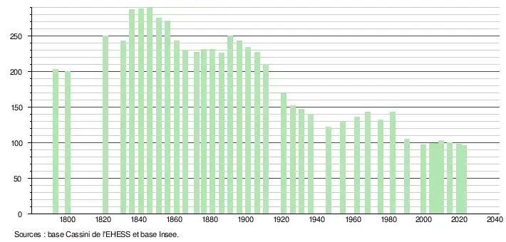 L'évolution du nombre d'habitants est connue à travers les recensements de la population effectués dans la commune depuis 1793. Pour les communes de moins de 10 000 habitants, une enquête de recensement portant sur toute la population est réalisée tous les cinq ans, les populations de référence des années intermédiaires étant quant à elles estimées par interpolation ou extrapolation[42]. Pour la commune, le premier recensement exhaustif entrant dans le cadre du nouveau dispositif a été réalisé en 2004[43].