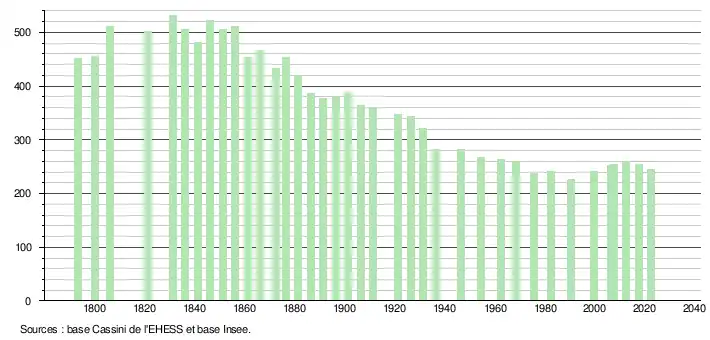 | L'évolution du nombre d'habitants est connue à travers les recensements de la population effectués dans la commune depuis 1793. Pour les communes de moins de 10 000 habitants, une enquête de recensement portant sur toute la population est réalisée tous les cinq ans, les populations de référence des années intermédiaires étant quant à elles estimées par interpolation ou extrapolation[22]. Pour la commune, le premier recensement exhaustif entrant dans le cadre du nouveau dispositif a été réalisé en 2007[23]. En 2022, la commune comptait 244 habitants[Note 1], en évolution de −5,06 % par rapport à 2016 (Landes : +5,78 %, France hors Mayotte : +2,11 %). |