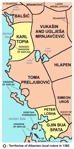 Nicéphore II avait perdu et ses territoires et sa vie aux mains des Albanais, mais ce sont les Serbes qui recueillirent son héritage. Syméon Uroš avait quitté l’Épire en 1356 pour réclamer la succession de Stefan Uroš IV Dušan qui avait échu à son neveu, Stefan Uroš V. En apprenant la mort de Nicéphore, il modifia ses plans pour conquérir plutôt la Thessalie qu’avait gouvernée Grégoire Preljub. Après s’être emparé de Trikkala, l’ensemble de la Thessalie tomba sous son contrôle et s’il continua à s’intituler « tsar des Grecs, des Serbes et des Albanais », il régna plutôt à partir de la Grèce où il avait été naguère gouverneur que de la Serbie[21],[22]. De là, à l’automne 1359, il entreprit de reconquérir l’Épire. Arta et Ioannina l’acceptèrent sans difficulté, mais il réalisa qu’il ne disposait pas de forces suffisantes pour expulser les Albanais, maintenant solidement implantés en Épire, Gjin Bua Shpata et Pjetër Losha ayant recueilli les fruits de la victoire de Karl Thopia. Ce dernier avait délaissé cette région pour concentrer ses forces sur celle située entre le lac de Shkodra et Durazzo (Durrës) qui faisait également la convoitise de la famille des Balšić depuis 1363. Réalisant qu’il préférait les plaines de Thessalie aux montagnes peu hospitalières de l’Épire, Syméon décida de régner par le truchement de seigneurs locaux et divisa son territoire en deux despotats : Pjetër Losha établit le despotat d’Arta autour de la ville du même nom, alors que Gjin Bua Shpata fut mis à la tête du despotat d’Angelokastron et de Lépante. L’Épire se retrouvait ainsi, sous le contrôle effectifs des Albanais[23],[24]. Toutefois, leurs divisions claniques et leurs querelles perpétuelles les empêchèrent de doter ces nouvelles entités de véritables structures étatiques si bien que l’Épire fut soumise à une véritable anarchie jusqu’à la conquête ottomane, laquelle commencée en 1430 par la prise de Ioannina se poursuivra jusqu’en 1479 avec la prise de Vonitsa[25].