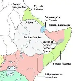 De leur côté, les Britanniques occupent Zeilah et Berbera[10] en 1885. Par ailleurs, la Grande-Bretagne tente de développer son implantation en Égypte et ambitionne de contrôler l'ensemble du bassin du Nil[5]. En 1896, au Soudan voisin, les mahdistes résistent toujours à l'envahisseur britannique mais finissent par céder en 1898[Note 3] ; la même année, la France développe ses positions djiboutiennes[10].
