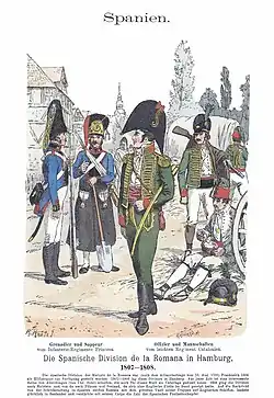 Chez les Espagnols, la division la Carrera était forte des régiments de ligne Principe et Zaragoza à trois bataillons chacun, des régiments léger Barbastro, Catalonia no 1 et no 2 et Girona à un bataillon chacun, des régiments de volontaires Vitoria, Escolares de Leon, Monforte de Lemos et Muerte à un bataillon chacun et d'une batterie d'artillerie à pied. La division Losada alignait les régiments de ligne Leon et Voluntarios de Corona à deux bataillons chacun, deux bataillons de grenadiers de la milice provinciale de Galice, les régiments légers Aragon no 1 et Aragon no 2 à un bataillon chacun, deux bataillons du régiment de volontaires Betanzos, les régiments de volontaires Del General, La Union no 1 et no 2 et Orense à un bataillon chacun, une compagnie de gardes nationaux et une batterie d'artillerie à pied[9],[14],[15].