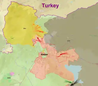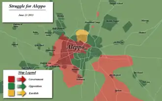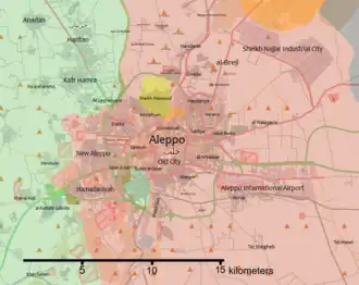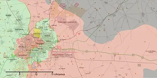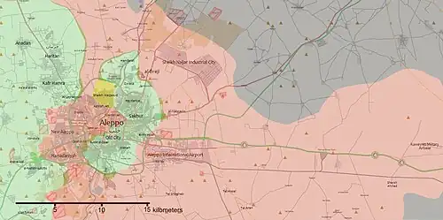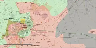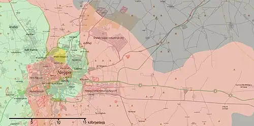 - Du 27 juillet 2016 ► Double offensive loyaliste et kurde. Les Kurdes capturent Youth housing, puis atteignent l'autoroute. De nuit, les rebelles bombardent la centrale électrique d'Alep. Courant coupé, ils fuient du District Bani Zeid pris en étau entre loyalistes (ouest, nord et sud)) et Kurdes (est).