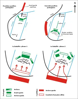 Le à 10 heures du matin, l'armée portugaise prend position au sommet de la colline face à la route par laquelle les Castillans doivent arriver. Les Portugais optent pour une stratégie qui a réussi aux Anglais lors des batailles de Crécy et de Poitiers : la cavalerie et les piétons sont au centre et les archers anglais sur les flancs. Des renforts commandés par Jean Ier de Portugal lui-même se tiennent prêts à intervenir. Prévoyant l'endroit de l'attaque, les Portugais ont pris soin de faire creuser des fossés et des chausse-trapes sur leurs arrières.
