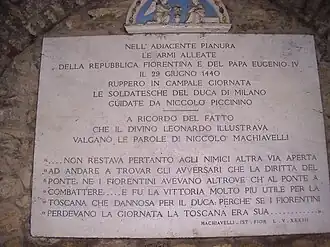 La bataille aurait sûrement été oubliée si, soixante ans plus tard, les magistrats de Florence, pour décorer la Salle des Cinq-Cents du Palazzo Vecchio avec des œuvres rappelant les principales actions de la République, n’avaient confié à Léonard de Vinci le soin de peindre la « Bataille d'Anghiari ». Après la réalisation des esquisses, la partie centrale, c'est-à-dire le combat autour du drapeau, fut posée au mur.