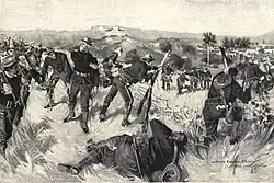 À 13 heures, les combats reprennent, Lawton ayant engagé ses réserves et disposant maintenant sur la ligne de front d'une puissance de feu très largement supérieure à celle des Espagnols. À l'Est, ceux-ci sont cloués sur place et ne peuvent plus circuler entre leurs positions défensives, ce qui joue en leur défaveur du fait de leurs faibles effectifs. Peu avant 13 h 30, les 4e et 25e régiments débutent l'assaut sur le fort en escaladant la colline par le Sud, suivi par les 1er et 17e régiments[25]. D'abord masqués par une rangée d'arbre, les assaillants se trouvent ensuite à découvert dans un champ d'ananas où ils sont la cible d'un tir intense provenant du fort. Leurs officiers les poussent alors en avant pour essayer de franchir les cinq cents derniers mètres, tout aussi exposés, le plus vite possible et limiter les pertes[26].