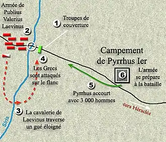 Comprenant que les renforts Lucaniens et Bruttiens ne viendront pas, Pyrrhus décide d'attaquer les Romains dans une plaine non loin de la rivière Siris (aujourd'hui Sinni), située entre les villes d'Héraclée et de Pandosia. Il prend position et décide d'attendre les Romains. Avant d'engager le combat, Pyrrhus envoie des diplomates au consul romain Laevinius, afin de proposer son arbitrage dans le conflit entre Rome et les populations du Sud de l'Italie. Il promet que ses alliés respecteraient sa décision, si les Romains acceptent de le prendre comme arbitre, dans ce conflit[18].