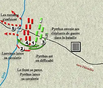 Dans cette lutte indécise, Mégaclès, que les Romains prennent pour Pyrrhus, est tué. Les Romains exultent, mais Pyrrhus se montre et ranime le courage de ses troupes. Il décide d'envoyer ses éléphants de guerre dans la bataille. Selon Florus « Leur masse, leur difformité, leur odeur inconnue, leur cri aigu, épouvantèrent les chevaux ». Leur panique et leur fuite provoque la défaite romaine[24],[25],[26]. La cavalerie épirote attaque alors les ailes de l'infanterie romaine.