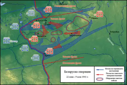 La bataille de Białystok–Minsk fut une opération stratégique allemande conduite par le groupe d'armées Centre durant l'offensive sur la frontière soviétique au tout début de l'opération Barbarossa. Elle se déroula du au . Son but, qui était d'encercler les forces de l'Armée rouge autour de Minsk, fut un succès. Toutes les tentatives russes de contre-attaques et de percées se soldèrent par des échecs. Ainsi, la Wehrmacht put faire plusieurs dizaines de milliers de prisonniers soviétiques[5] et put avancer dans l'Union soviétique si rapidement que certains pensèrent que l'Allemagne avait déjà gagné la guerre contre la Russie.