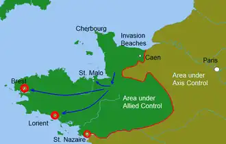 Après avoir piétiné pendant plusieurs semaines en Normandie, les Alliés, menés par le général George S. Patton, réussissent la percée d'Avranches et progressent rapidement vers le sud de la péninsule du Cotentin pour isoler la Bretagne. Le VIIIe corps d'armée des États-Unis est ensuite chargé de prendre la péninsule bretonne et de protéger le flanc nord de la percée. Les unités de la Wehrmacht, piégées en Bretagne, se replient dans les ports fortifiés pendant que les troupes de la Troisième armée des États-Unis les encerclent. La Bretagne, à l'exception des principaux ports, est libérée en quelques jours seulement. Entrevoyant la possibilité d'encercler la majeure partie de l'armée allemande en Normandie, le commandement allié demande à une grande partie des divisions américaines ayant participé à la percée d'Avranches de se déplacer vers l'est pour prendre l'ennemi à revers au sud.