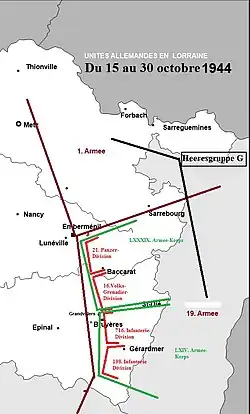 Les combats des allemands autour de Bruyères ont donc lieu sous le commandement unifié de la 19e Armée, avec ses deux corps d'armée, le 64e et le 89e, respectivement au sud et au nord de Bruyères[7].