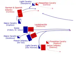 - ↑ Oman, Art of War, p. 238. Les Florentins de l'escadron Baglioni, qui ne sont pas poursuivis par les Français après le choc, sont parvenus à se reformer.