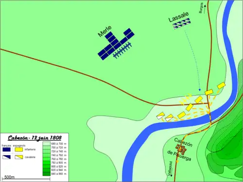 Le 12 juin 1808 au matin, la cavalerie de Lasalle se lança à l’assaut des positions ennemies. En quelques minutes, les troupes espagnoles furent balayées et massacrées, les survivants, poursuivis par la cavalerie française, s’enfuirent par le pont ou par la route de Valladolid. La Cuesta ne pouvait plus offrir une quelconque résistance et le général Lasalle fit une entrée triomphale dans Valladolid, obligeant les Espagnols à continuer la lutte plus à l’Ouest.