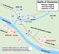 Après sa victoire lors de la bataille de Fayetteville, le , et une poursuite le long de la rivière Kanawha, le général William Wing Loring parvient à rattraper les forces du colonel Joseph Andrew Jackson Lightburn à Charleston, dans la matinée du . Une grande partie des combats prend la forme d’un duel d’artillerie, en particulier après que Lightburn a replié ses troupes sur la rive ouest de la rivière Elk. Lorsque Lightburn fait incendier le pont qui enjambe la rivière, la poursuite de Loring devient difficile. Lightburn se retire alors vers l’Ohio, hors de portée, mais choisit d’éviter la route directe longeant la rivière Kanawha afin d’échapper à la cavalerie confédérée qui l’y attend. Il emporte avec lui un convoi de 700 chariots de ravitaillement.