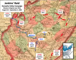 L’un des volets essentiels du plan de Loring consiste à envoyer une force de cavalerie traverser quelque 800 kilomètres de territoire contrôlé par l’Union, dans le but de couper la principale voie de retraite des troupes adverses en aval du fleuve[34]. Cette force, forte d’environ 550 cavaliers[35], est placée sous le commandement du brigadier général Albert G. Jenkins. Le , Jenkins entame sa progression vers le nord depuis Salt Sulphur Springs. Le , il s’empare d’un dépôt d’approvisionnement de l’Union, ce qui lui permet de réarmer ses hommes, jusque-là mal équipés[36]. L’annonce des mouvements de Jenkins parvient au colonel unioniste Lightburn, dont le quartier général se trouve à Gauley Bridge. Lightburn ordonne alors la concentration de ses forces, alors que le poste avancé de l’Union à Raleigh Court House est abandonné le [37]. Le colonel Edward Siber redéploie sa brigade vers le nord, à Fayette Court House. Le , Jenkins atteint la petite localité de Buffalo, située sur la rivière Kanawha entre Charleston et la rivière Ohio. Le raid mené par Jenkins est alors considéré comme un succès, d'autant plus que les troupes de l’Union situées en amont ne se trouvent plus sur sa trajectoire[38]. Le lendemain, les brigades quittent leurs camps et entament une marche vers le nord[39].