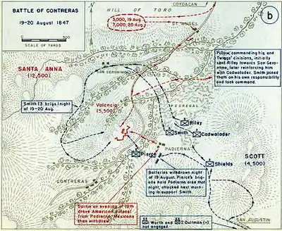 Le commandant et président mexicain Antonio López de Santa Anna envoie une force de 5 000 hommes commandée par le général Gabriel Valencia pour s'opposer aux Américains qui débouchent à Contreras. Les troupes américaines attaquent et mettent en déroute l'armée de Valencia à Contreras.