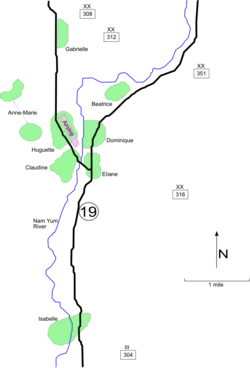 - à l’est de la rivière Nam Youm, les PA « Dominique », où se trouve la plus haute position du camp retranché (« Dominique 2 »), tenus par le III/3e RTA