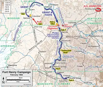 Les et , Grant débarque deux divisions juste au nord de Fort Henry, sur le Tennessee[note 1]. Son plan est de marcher sur Fort Henry le , pendant que celui-ci sera attaqué par les canonnières de l'US Navy commandées par l’amiral Andrew Hull Foote.