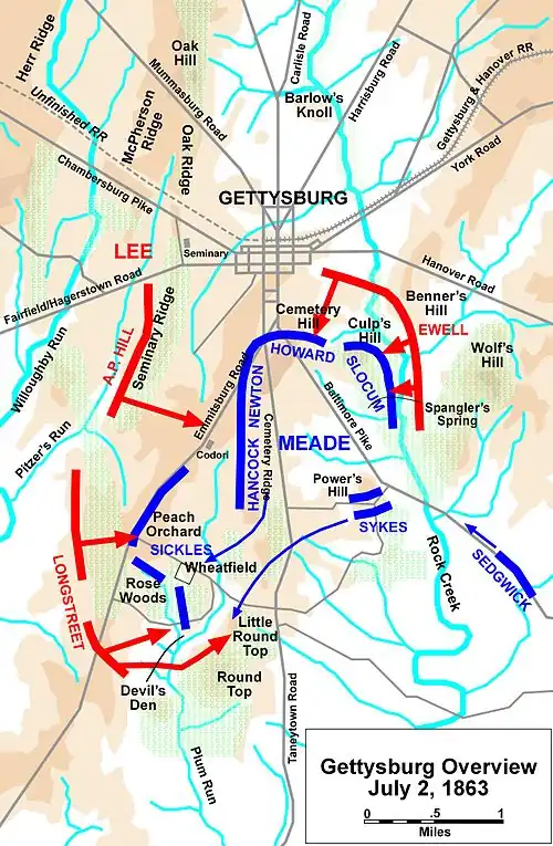 La bataille de Gettysburg se déroule du 1er au à Gettysburg (Pennsylvanie) pendant la guerre de Sécession. Cette bataille, la plus lourde de la guerre quant aux pertes humaines, se conclut par la défaite des Confédérés qui laissent le terrain aux Unionistes. Elle est souvent considérée comme le principal tournant de la guerre.