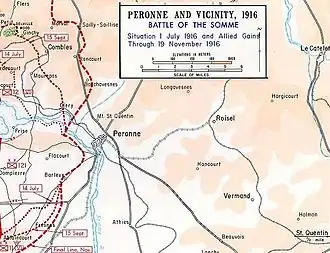 3 - 6 septembre : la 6e armée française attaque au nord de la Somme. À midi le 3 septembre, elle capture Cléry et la position allemande le long de la route entre Cléry et la Forêt et la totalité du village de Le Forêt. Sur la gauche, le 1er corps d'armée occupe les hauteurs au sud de Combles et la lisière est du bois de Douage où il capture 2 000 prisonniers et douze canons. La 10e armée attaque la rive sud, le 4 septembre, entre Chilly et Barleux. Après trois jours d'attaque, elle occupe Chilly et Soyécourt mais échoue à capturer Vermandovillers, Deniécourt et Barleux. La 6e armée attaque sur la rive nord avec 7e corps, qui progresse sur la gauche et gagne du terrain autour de Cléry et au nord. les Allemands contre-attaquent dans le ravin de Combles et bloquent l'avance française à Rancourt. Lorsque les Britanniques prennent la ferme de Falfemont le 5 septembre, les Français arrivent à capturer la totalité du ravin de Combles, des patrouilles capturent la Ferme de l'Hôpital à 800 mètres (0,5 mile) à l'est de Le Forêt. Le 7e corps rencontre le 33e corps sur sa droite, qui prend Omiécourt sur la rive sud de la Somme. Une attaque du 1er corps à la jonction avec la 4e armée britannique le 6 septembre est repoussée.