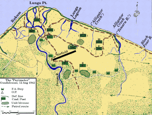 Périmètre de défense initial des Marines autour de la piste d'atterrissage de Lunga Point, Guadalcanal, le .