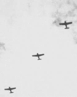 Le , le porte-avions d'escorte USS Long Island livra deux escadrilles d'avions des Marines à Henderson Field : une escadrille de dix-neuf Grumman F4F Wildcat et une escadrille de douze Douglas SBD Dauntless. Les chasseurs des Marines entrèrent en action le jour suivant contre le premier des raids aériens presque quotidiens effectués par les bombardiers japonais. Le , vingt-deux P-39 Airacobras de l'US Army[57] et leurs pilotes arrivèrent à Henderson Field. Comme le code allié pour l'île était Cactus, ce fut rapidement le surnom (Cactus Air Force-CAF) qui fut donné aux forces aériennes qui y opéraient. À la fin du mois d'août, l'aérodrome abritait un peu plus de soixante avions.