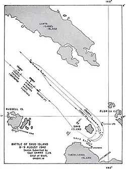 Cette bataille constitue le premier engagement naval de la bataille de Guadalcanal. Le vice-amiral Gunichi Mikawa avait prévu une contre-attaque et rassemblé pour ce faire la 6e division de croiseurs du contre-amiral Aritomo Gotō stationné à Kavieng avec les moyens de la 8e flotte de la Marine impériale japonaise disponibles à Rabaul. Dans la soirée du 7 août cinq croiseurs lourds (Chōkai sur lequel le vice-amiral Mikawa avait sa marque, Kako, Furutaka, Aoba, Kinugasa), deux croiseurs légers (Tenryu et Yubari) et un destroyer (Yunagi) se rassemblèrent au cap St. George sous les ordres du vice-amiral Mikawa et se mirent en route pour Guadalcanal. Contournant l'île de Bougainville par le nord, où ils furent repérés par un sous-marin américain et une reconnaissance aérienne australienne, ils descendirent « the Slot » (« la fente »)[Note 12] l'après-midi du 8 août. Auparavant, le vice-amiral Mikawa avait envoyé des hydravions de reconnaissance pour le renseigner sur la situation à Guadalcanal, lesquels identifièrent deux groupes navals américains près de Guadalcanal et de Tulagi où il avait l'intention d'attaquer la nuit suivante[46]. Au cours de la nuit du au , alors que les navires de transports américains procédaient au déchargement des troupes et du matériel, deux groupes de croiseurs et de destroyers alliés patrouillant de part et d'autre de l'île de Savo et appartenant au groupe naval de couverture (la Task Force 62), sous le commandement du contre-amiral Victor Crutchley, furent attaqués et défaits de nuit par le groupe naval du vice-amiral Mikawa et du contre-amiral Gotō.