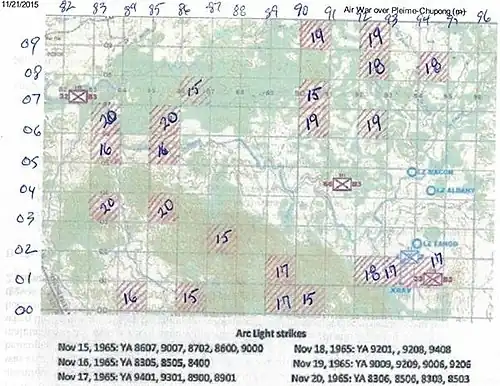 À 9 h 0, le centre d'opérations tactiques du 1er de cavalerie soumet une demande de frappe aérienne de B-52 à J3/MACV pour demain 18 novembre à 13h00 ; priorité 1. 9201-9401-9208-9408, priorité 2. 9009-9209-9006-9206, priorité 3. 8306-8506-8303-8503[32].