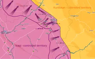 Dans la nuit du 15 au , à minuit, les forces irakiennes passent à l'offensive dans la région de Kirkouk[24]. Le Premier ministre Haïder al-Abadi donne l'ordre à l'armée et la police de « sécuriser » les bases militaires et les installations fédérales de la province[24]. Les forces irakiennes assurent cependant ne pas avoir l'intention d'entrer dans la ville de Kirkouk ; elles appellent par haut-parleurs les peshmergas à se retirer de leurs positions[25]. L'opération est menée par les unités du contre-terrorisme — dites de la division d'or — la 9e division blindée de l'armée irakienne, la police fédérale et les milices chiites des Hachd al-Chaabi[26],[27].