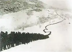 Les Serbes doivent abandonner leur territoire national et entreprendre en plein hiver, dans les montagnes enneigées, une retraite à travers l'Albanie (en). Sur 250 000 soldats et civils, décimés par le froid, les maladies et les attaques des tribus albanaises, seulement 155 000 arrivent vivants sur la côte d'où ils sont embarqués pour Corfou.