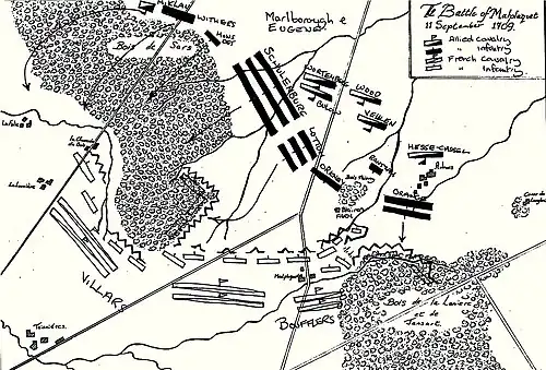 Les forces des coalisés, 86 000 hommes et 100 canons[5] surtout formés d'éléments autrichiens et néerlandais commandés conjointement par le duc de Marlborough et le prince Eugène de Savoie, s'opposent à l'armée franco-bavaroise des maréchaux Villars et Boufflers, forte de 75 000 hommes et de 80 canons[6]. L'artillerie est commandée par Saint-Hilaire. Les deux armées se mettent en position face à face, à portée de canon. Le 11 septembre 1709 à 9 h du matin, Eugène de Savoie, avec l'appui du régiment prussien du comte von Finckenstein, amorce une offensive sur l’aile gauche française. Il y a massé 83 bataillons et n’en laisse que 30 face à l’aile droite française qui, elle, en compte 70. L’idée directrice de ce plan est de forcer Villars à engager ses réserves et ainsi à affaiblir son centre ; mais le maréchal français fait au contraire glisser sa première ligne, esquissant un demi-repli.
