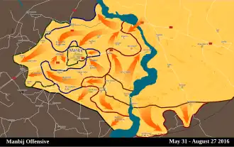 - 1 2 Agathocle deSyracuse, #Manbij : Final assault for the city is ready to start. 4000 #SDF troops vs 2000 #IS (Sources : Sohr, US military spokesman), twitter, 9 juin 2016.