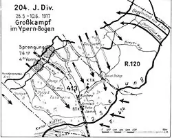 Les régiments allemands tiennent entre 640 et 1 100 mètres (700-1 200 yards) de première ligne avec un bataillon en première ligne, un second bataillon en soutien et un 3e bataillon en réserve à une distance de 4,8 km à 6,4 km à l'arrière du front. Le bataillon en ligne a trois compagnies dans le premier système défensif sur des lignes de défenses appelées « IA », « IB » et « IC » et la dernière compagnie du bataillon est placée sur la ligne intermédiaire à Sonne associée avec une compagnie du bataillon de soutien immédiatement disponible pour une contre-attaque entre la première ligne et la seconde ligne (Höhen) sur la ligne de crête faîtière. Les trois autres compagnies du bataillon de soutien à l'abri dans la 2e ligne (Höhen). Environ 32 postes de mitrailleuses régimentaires sont dispersés sur le secteur autour de la zone défensive. La défense allemande est mobile, le rôle des Stosstrupps placés dans la ligne « IC » est de mener des contre-attaques pour reprendre « IA » et « IB ». En cas de repli, les bataillons de soutien doivent alors avancer pour reprendre le terrain perdu excepté sur la colline de Spanbroekmolen qui doit être défendue à tout prix.