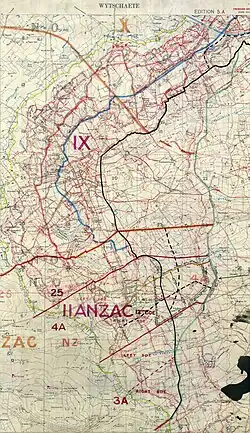 Le 2e corps d'armée de l'ANZAC (en) est placé face à la partie sud de la crête et au village de Messines. La 3e division d'infanterie australienne placée à droite est désorganisée par un bombardement allemand au gaz sur le bois de Ploegsteert (« Plugstreet ») aux alentours de minuit faisant 500 victimes au cours de la marche d'approche, mais l'attaque entre Saint-Yves et la Douve commence à l'heure. Les 9e et 10e brigades d'infanterie bénéficient des effets de l'explosion de quatre mines sur les tranchées 122 et 127, qui forment des cratères de 61 mètres (200 pieds) de large et 6,1 mètres (20 pieds) de profondeur. Les cratères formés perturbent les formations d'attaque de l'infanterie australienne, qui se fondent dans une seule vague avant de se reformer à mesure de leur avance. La division néo-zélandaise évite le bombardement au gaz allemand et passe la colline 63. Les deux brigades traversent le lit asséché de la rivière Steenebeke et s'emparent de la ligne de front allemand sans difficultés bien que la mine de la petite Ferme de Douve n'ait pas explosé puis avancent vers le village de Messines. À la gauche du corps, la 25e division a ses lignes de départ 550 mètres (600 yards) derrière la ligne de la division néo-zélandaise. Elle rattrape son retard aidée par l'explosion de la mine de la ferme de l'Ontario.