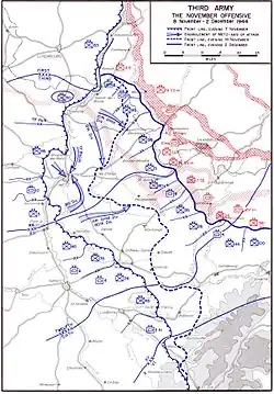 Point d'orgue de la campagne de Lorraine, la « bataille de Metz » se déroula du 27 août au 13 décembre 1944, dans l'ouest mosellan, entre Thionville au nord et Pont-à-Mousson au sud. L’attaque de l'ancienne place forte du Reich par la IIIe armée américaine rencontra une forte résistance de la défense allemande, et se solda par de lourdes pertes de part et d'autre de la ligne de front[note 2]. La ville fut prise le 22 novembre 1944, mais certains forts de Metz ne déposèrent les armes qu’en décembre 1944. La bataille se termina par la victoire des Alliés, et par la reddition des forces allemandes dans ce secteur du front.