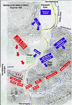 - ↑ Appuyée par le 54th Virginia infantry de Trigg et les Mounted Rifles de Witcher. Des unités du 1st Kentucky cavalry, sous Shawhan et Holliday, protègent le train.