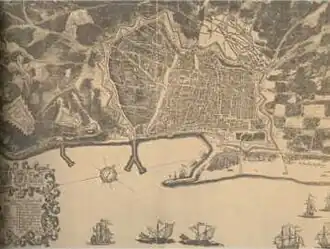 - Les défenseurs du Château de Montjuïc[19], avec 9 compagnies de miliciens de la Coronela : marchands de toiles (située dans le fortin), savetiers ou cordonniers, tailleurs, passementiers, membres de la confrérie de Saint-Étienne (qui réunissait les métiers de fabricants de bât, ferblantiers, armuriers et dinandiers) situé en face de Castelldefels, fabricants de voiles (capitaine Ambrosi Gallart i Caldes), taverniers, tisserands de lin et tanneurs qui étaient de garde à la Tour de Damians) et d'autres du Tercio de Santa Eulàlia[22] qui faisaient partie de la Coronela de Barcelona (ca), le capitaine Francesc de Cabanyes avec 200 miquelets, 300 mousquetaires et piquiers français du régiment d'infanterie de Sérignan dirigés par George Stuart, le seigneur d'Aubigny, situés dans le fortin et 8 pièces d'artillerie de bronze.