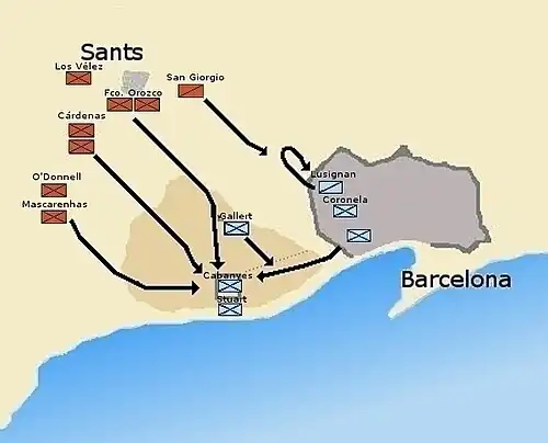 Après sa victoire lors de la bataille de Martorell, Pedro Fajardo a choisi d'attaquer Barcelone rapidement pour éviter le regroupement des troupes catalanes dispersées par le Vallès avec de nouveaux contingents catalans et français qui étaient en chemin. Il voulait attaquer Montjuïc en encerclant la montagne et en commençant à l'investir avec deux mille mousquetaires suivis par le gros de l'infanterie, et alors il aurait ouvert un second front par une attaque directe dirigée par Carlo Maria Caracciolo, le duc de San Giorgio, contre la porte de Sant Antoni avec le gros de la cavalerie et l'artillerie, et une partie de l'infanterie, qui devrait empêcher l'arrivée d'une aide à la forteresse[24]. L'armée hispanique devrait alors se poster sur Montjuïc et serait ravitaillée par la mer, évitant les périls de Collserola, où elle aurait pu constituer une cible facile pour les guérilleros.