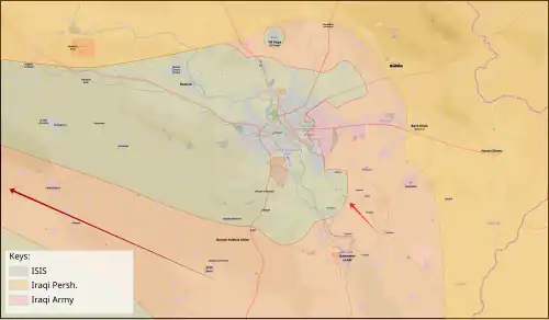 Contrairement à ses autres batailles livrées contre l'État islamique, l'armée irakienne ne laisse cette fois aucune voie de sortie aux djihadistes[387]. Le but tactique de cette voie, aussi appelée la « porte dorée » ou le « trou », était de laisser une issue aux assiégés pour qu'ils puissent s'enfuir, permettant ainsi d'épargner les civils, les infrastructures et des pertes supplémentaires dans les rangs de l'armée[387]. Cette fois les djihadistes sont entièrement encerclés et les demandes formulées par les chefs de l'État islamique pour établir une voie de sortie à leurs combattants sont rejetées[387]. Selon l'agence de presse Reuters, le plan irakien prévoyait initialement de laisser le front ouest ouvert puis de bombarder les djihadistes qui s'y engouffreraient, mais l'Iran aurait fait pression pour que l'Irak change son plan de bataille, de peur que les hommes de l'EI ne gagnent la Syrie[387]. La coalition internationale aurait également accepté ce changement de plan pour les mêmes raisons[387].