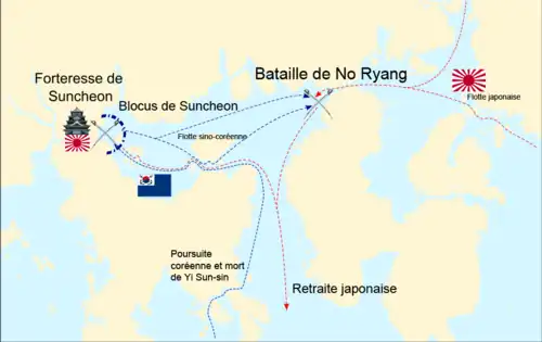 La forteresse de Suncheon, la plus à l'ouest du réseau de wajō japonais, contient 14 000 soldats commandés par Konishi Yukinaga, qui fut le chef de l'avant-garde japonaise durant la première invasion en 1592[7]. L'amiral Yi Sun-sin et Chen Lin bloquent la retraite de Konishi. Ce dernier tenta de convaincre Chen Lin de lever le blocus en lui envoyant de nombreux présents. Si ce dernier accepte de retirer la flotte sino-coréenne, l'amiral Yi, lui, refuse[8].