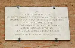 Dans la matinée du 9 septembre, les avant-gardes allemandes investissent Rome, contrariées en divers points de la ceinture urbaine, parfois près du centre-ville, par la réaction spontanée et non coordonnée des corps militaires et civils armés qui laisseront sur le terrain 1 167 militaires morts et 120 civils, dont une dizaine de femmes et même une nonne, infirmière en première ligne[4].