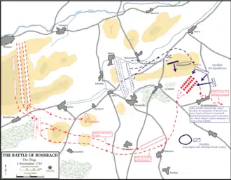 Malgré un avantage numérique important (41 000 contre 22 000 hommes), l'armée franco-impériale commandée par le prince de Soubise, Charles de Rohan, est défaite, notamment en raison de la charge de la cavalerie prussienne dirigée par le général von Seydlitz.