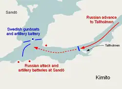 Après avoir échoué à détruire la flotte côtière russe près de Turku, les Suédois choisissent d'attaquer les renforts russes. La flotte suédoise contrôlant la haute mer, les Russes sont obligés d'utiliser les bras de mer côtiers. Les Suédois détachent donc un groupe de canonnières, sous les ordres du capitaine Sölfverarm, pour barrer le passage au nord de l'île de Kemiö, près de la petite île de Tallholmen[2].