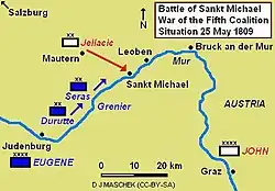 Dans la soirée du 23 mai, la colonne de Jelačić traversa la localité de Mautern in Steiermark, sise sur la rivière Mur à 16 km au nord-ouest de Sankt Michael et à 60 km au nord-ouest de Graz. Au même moment, le gros de l'armée d'Eugène atteignit Judenburg sur la Mur, à 33 km au sud-ouest de Sankt Michael, certaines unités n'étant distantes de cette dernière ville que d'une vingtaine de kilomètres. L'archiduc Jean prévint Jelačić qu'Eugène se dirigeait sur Bruck an der Mur, à 40 km au nord de Graz. Les axes de progression du commandant en chef français et du général autrichien se croisaient précisément à Sankt Michael. À la même époque, Eugène apprit que la division Jelačić se trouvait dans les parages et ordonna au général Paul Grenier, l'un de ses divisionnaires, de se diriger à marche forcée au nord-est avec les deux divisions les plus proches, celles des généraux Jean-Mathieu Seras et François Durutte, afin d'intercepter les Autrichiens[20]. Quant à Jelačić, il venait de se séparer du gros des miliciens de Salzbourg et de la majeure partie de son artillerie, ne conservant avec lui que quatre canons[7].