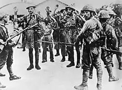 - ↑ Selon Peter Elphick (op. cit.), l'Union Jack est porté par le brigadier-general Newbigging et le drapeau blanc par le major Cyril Wild du 3e Indian corps