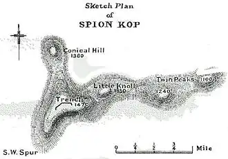 Spion Kop, au nord-est des troupes de Warren, était la colline la plus imposante de la région, culminant à environ 430 mètres au-dessus de la plaine environnante. Elle se trouvait au centre des lignes de défenses boers. Si les Britanniques pouvaient prendre cette position et y amener leur artillerie, ils étaient en mesure de maîtriser les flancs des Boers environnants[5]. Au cours de la nuit du 23 janvier, Warren envoya l'essentiel de ses forces commandées par le Général Major Edward Woodgate pour sécuriser Spion Kop. Le Lieutenant Colonel Alexander Thorneycroft fut désigné pour l'assaut initial (Thorneycroft était l'un des 6 officiers des "services spéciaux", parmi lesquels se trouvaient également Robert Baden-Powell et Herbert Plumer, envoyés depuis peu en Afrique du Sud pour recruter des renforts locaux. L'infanterie montée de Thorneycroft fut recrutée au Natal et comptait 360 hommes.)