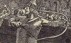 - Ce ne fut pas un si grand fracas, rétorqua le roi, mais prend mon arc et continue de tirer », et il lui lança son arc.Einar l'attrapa, engagea aussitôt une flèche et tendit l'arc bien au-delà de la pointe de la flèche. Il s'exclama alors : « Trop souple, trop souple est l'arc du souverain ! » Il rejeta l'arc, se saisit de son bouclier et de son épée et se mit à combattre[38]. »