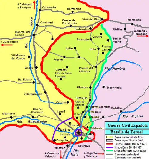 La dernière phase offensive de la bataille de Teruel commença le , par un bombardement massif de six heures. Le général Juan Yagüe traversa l'Alfambra et avança vers le sud en longeant la rive droite de la rivière, afin de couper la ville de toute communication par le nord. Le lendemain, le Corps d'armée de Galice du général Antonio Aranda, au sud de la ville, repoussèrent les républicains. Les deux généraux nationalistes prenaient alors les défenses républicaines en tenaille.