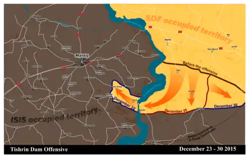 Le , les FDS poursuivent leur offensive vers le sud, le long de la rive est de l'Euphrate, et réussissent à s'emparer de plusieurs villages puis du barrage de Tichrine, situé sur le fleuve. La prise est stratégique car elle permet de franchir l'Euphrate et coupe ainsi la route reliant Manbij à Racca, et isolant ainsi cette dernière ville, fief de l'État islamique, cible désignée de la coalition dans le futur[5]. De plus, le barrage alimente en électricité les zones alentour[1]. Selon un communiqué de la coalition syrienne, cinq djihadistes sont tués durant les opérations et huit autres capturés vivants[6]. Le lendemain, les forces de la coalition syrienne franchissent pour la première fois l'Euphrate et s'emparent sur l'autre rive de la ville de Tichrine, située à l'ouest du barrage. Quinze combattants de l’État islamique auraient été tués durant ces opérations[7]. Les FDS se rapprochent ainsi à environ vingt kilomètres de la ville de Manbij, dans laquelle quatre personnes soupçonnées d'être liées aux FDS auraient été exécutées par l’État islamique.