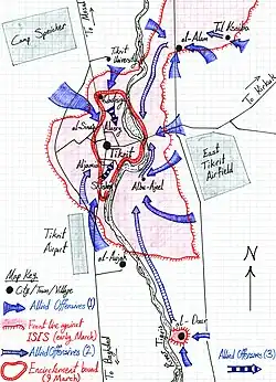 Le , les forces gouvernementales irakiennes engagent 27 000 hommes — troupes régulières irakiennes mais surtout milices chiites et milices tribales sunnites loyalistes[23] — dans une offensive sur Tikrit, Al-Dour ou Ad-Dawr au sud et Al-Alam au nord[24],[1]. Il s'agit alors de leur 36e offensive contre Tikrit[25]. Mais comme dans les précédentes tentatives, les forces irakiennes piétinent, ralenties par les sniper de l'EI et de nombreux engins explosifs improvisés[26],[27]. Le , l'armée irakienne parvient à entrer dans Al-Dour, au sud de Tikrit[28]. Le 8, elle s'empare du village d'Albou Ajil, à l'est de la ville, et les djihadistes se replient sur Al-Alam. Le , l'EI fait exploser à l'est l'unique pont de la région qui enjambe le fleuve Tigre, afin de ralentir la progression des troupes irakiennes. Par ailleurs ces dernières prennent le même jour le contrôle du centre d'Al-Alam, dans les faubourgs nord de Tikrit, et encerclent complètement Al-Dour à l'ouest[29],[30].
